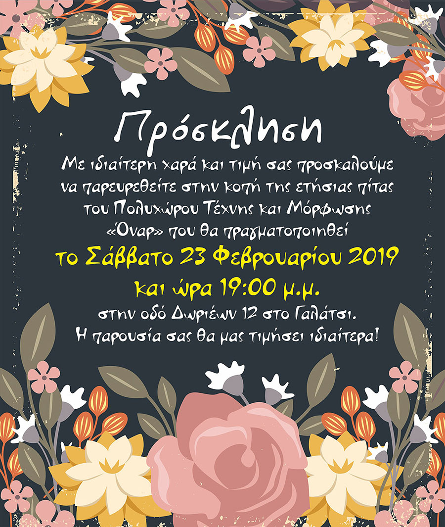Με ιδιαίτερα μεγάλη χαρά σάς προσκαλούμε να παρευρεθείτε στην κοπή της ετήσιας πίτας του Πολυχώρου Τέχνης και Μόρφωσης «Όναρ» που θα πραγματοποιηθεί το Σάββατο 23 Φεβρουαρίου 2019 και ώρα 19:00, στην οδό Δωριέων 12 στο Γαλάτσι.
