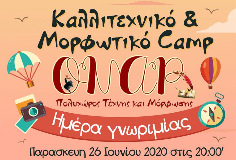 Με πολλή χαρά σας καλωσορίζουμε για ακόμη μία χρονιά στο Καλοκαιρινό CAMP 2020 του Πολυχώρου Τέχνης και Μόρφωσης «ΟΝΑΡ»! Σας προσκαλούμε λοιπόν σε μία ημέρα γνωριμίας με τον χώρο και τους δασκάλους μας την Παρασκευή 26 Ιουνίου 2020 και ώρα 20:00. Τα ποικίλα καλλιτεχνικά και μορφωτικά εργαστήρια θα πραγματοποιηθούν από έμπειρους παιδαγωγούς που σκοπό θα έχουν την ανάπτυξη δεξιοτήτων, την καλλιέργεια της φαντασίας, την έκφραση της δημιουργικότητας και την ευχάριστη αξιοποίηση του ελεύθερου χρόνου των παιδιών.