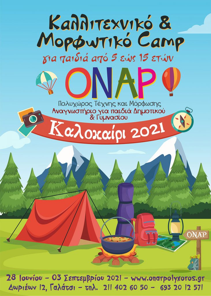 Με ιδιαίτερη χαρά σας καλωσορίζουμε στο φετινό Camp του Πολυχώρου Τέχνης και Μόρφωσης «Όναρ». Άλλο ένα καλοκαίρι σας καλούμε να το περάσουμε μαζί με γέλια, χαρά, παιχνίδια και δημιουργία! Στόχος μας το καλοκαίρι του 2021 να μείνει αξέχαστο στους μικρούς μας φίλους και να απολαύσουν την κάθε μέρα τους με δραστηριότητες οι οποίες θα εστιάζουν στην ψυχαγωγία μέσα από τις τέχνες, τις επιστήμες, τον αθλητισμό και τις υπόλοιπες καινοτόμες δράσεις μας.