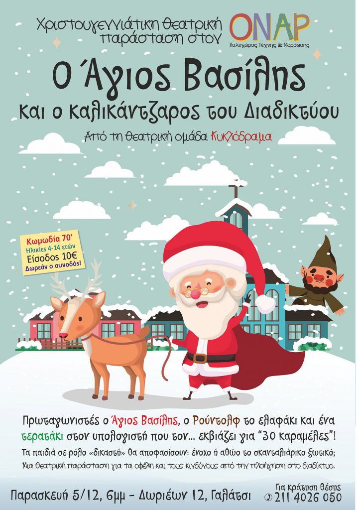 Μια διαφορετική χριστουγεννιάτικη θεατρική παράσταση θα φιλοξενήσει την Παρασκευή 5 Δεκεμβρίου στις 6μμ ο πολυχώρος τέχνης και μόρφωσης ΟΝΑΡ με τίτλο «Ο Άγιος Βασίλης και ο καλικάντζαρος του Διαδικτύου».