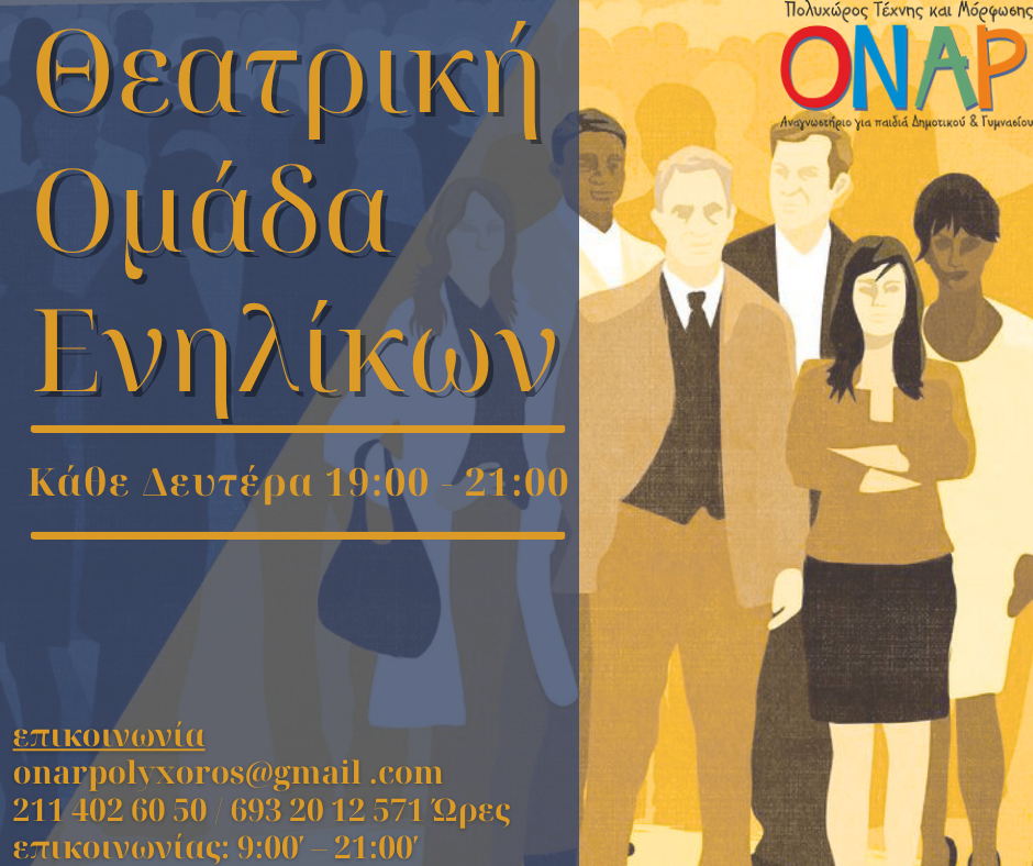 Κάθε Δευτέρα για δύο ώρες, 7-9μμ, στον Πολυχώρο ΟΝΑΡ λειτουργεί Θεατρική Ομάδα Ενηλίκων.