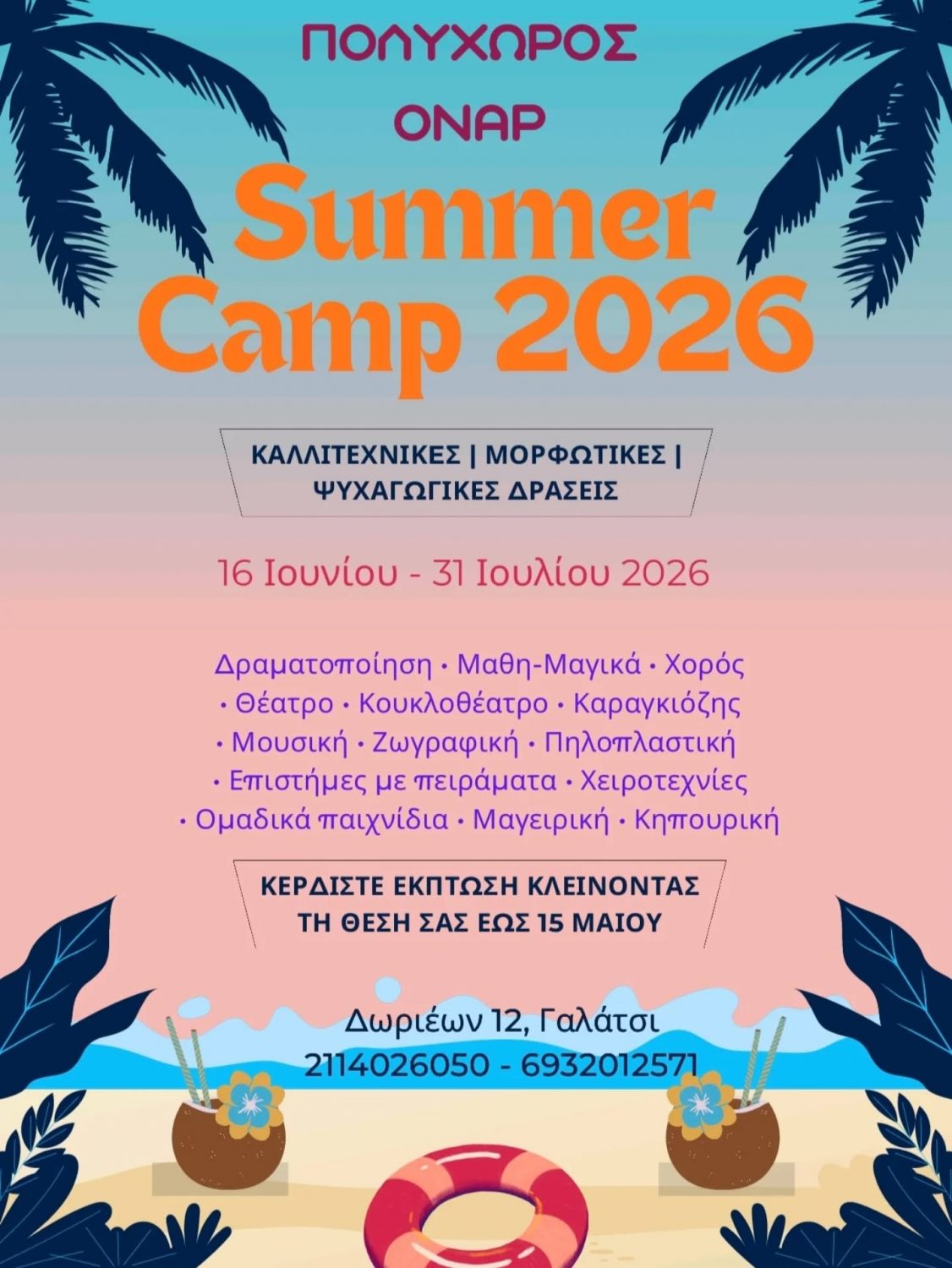 Από τις 16 Ιουνίου έως και τις 10 Σεπτεμβρίου 2026 και για συνολικά 9 εβδομάδες ο πολυχώρος Τέχνης και Μόρφωσης ΟΝΑΡ στο Γαλάτσι θα λειτουργήσει για μια ακόμα χρονιά – την ένατη κατά σειρά- το καλοκαιρινό καμπ ή Summer Camp φιλοξενώντας τους μικρούς φίλους και φίλες μας.