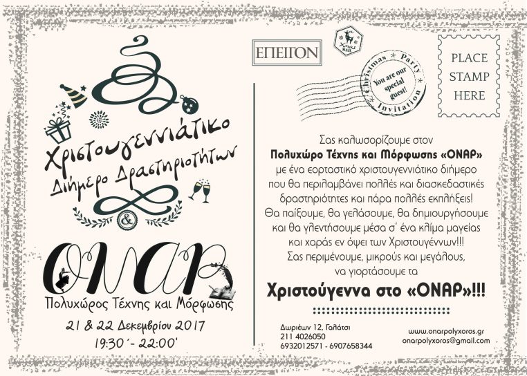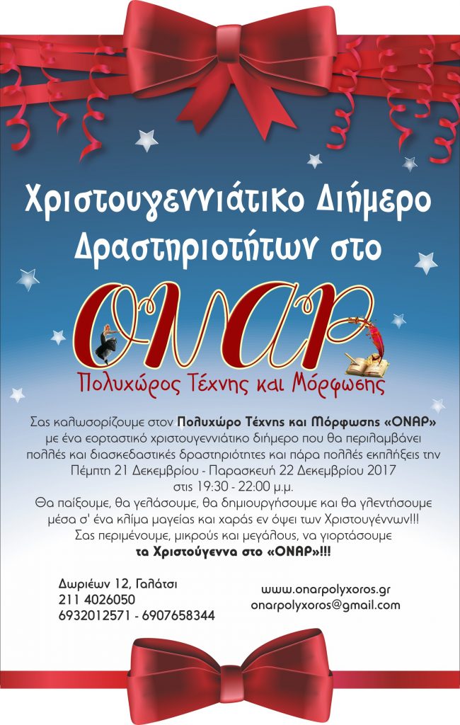 Σας καλωσορίζουμε στον Πολυχώρο Τέχνης και Μόρφωσης «ΟΝΑΡ» με ένα εορταστικό χριστουγεννιάτικο διήμερο που θα περιλαμβάνει πολλές και διασκεδαστικές δραστηριότητες και πάρα πολλές εκπλήξεις την